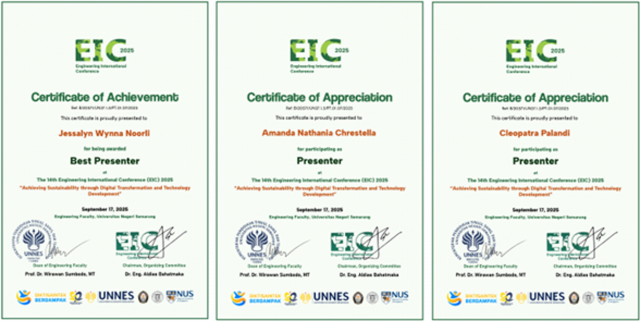 Ketika artikel tersebut yang berjudul “Feasibility Analysis of a Sustainable Refillable Drinking Water Business in Tangerang” dikirim ke Engineering International Conference (EIC) 2025, karya mereka diterima. Jessalyn dipercaya menjadi presenter tim, dan dari forum itu ia membawa pulang Best Presenter Award